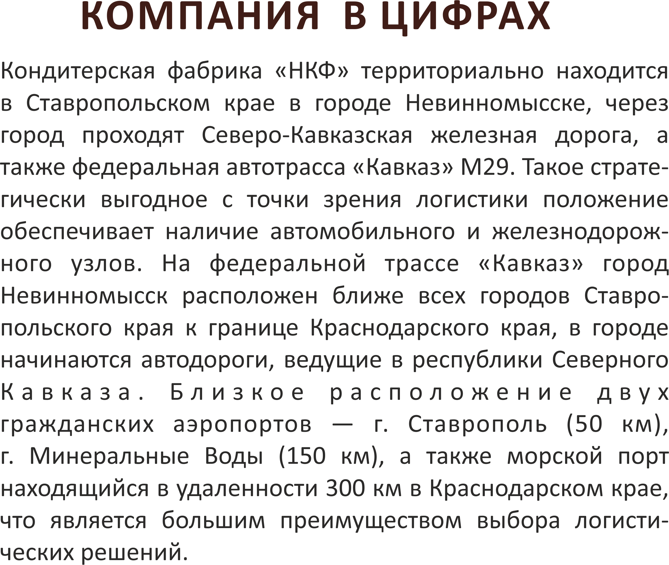 Кондитерская фабрика ООО «НКФ» — это современное российское предприятие в Северо-Кавказском федеральном округе, которое производит широкий ассортимент кондитерских изделий. Постоянный поиск новых направлений развития, совершенствование и оптимизация рецептур и технологии производства позволяет нам ежегодно расширять ассортимент продукции. Кондитерская фабрика ООО «НКФ» занимается производством и реализацией высоко-качественных кондитерских изделий. Продукция производится по советским рецептурам, прославившимся качеством на весь мир, технология производства держится в секрете, и передается из поколения в поколения. При производстве нашей продукции используется новейшее оборудование. Упаковка кондитерских изделий производится в современные безопасные материалы. Ассортимент продукции насчитывает свыше 70-ти видов кондитерских изделий. Мы регулярно участвуем в профильных выставочных мероприятиях на территории России, Европы, стран Ближнего Востока и Азии.